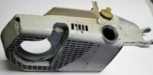 A used fuel tank assembly for a Stihl 031, includes fan housing, tank housing and shroud. This is the older style with extended tail. Pictures represent actual part.